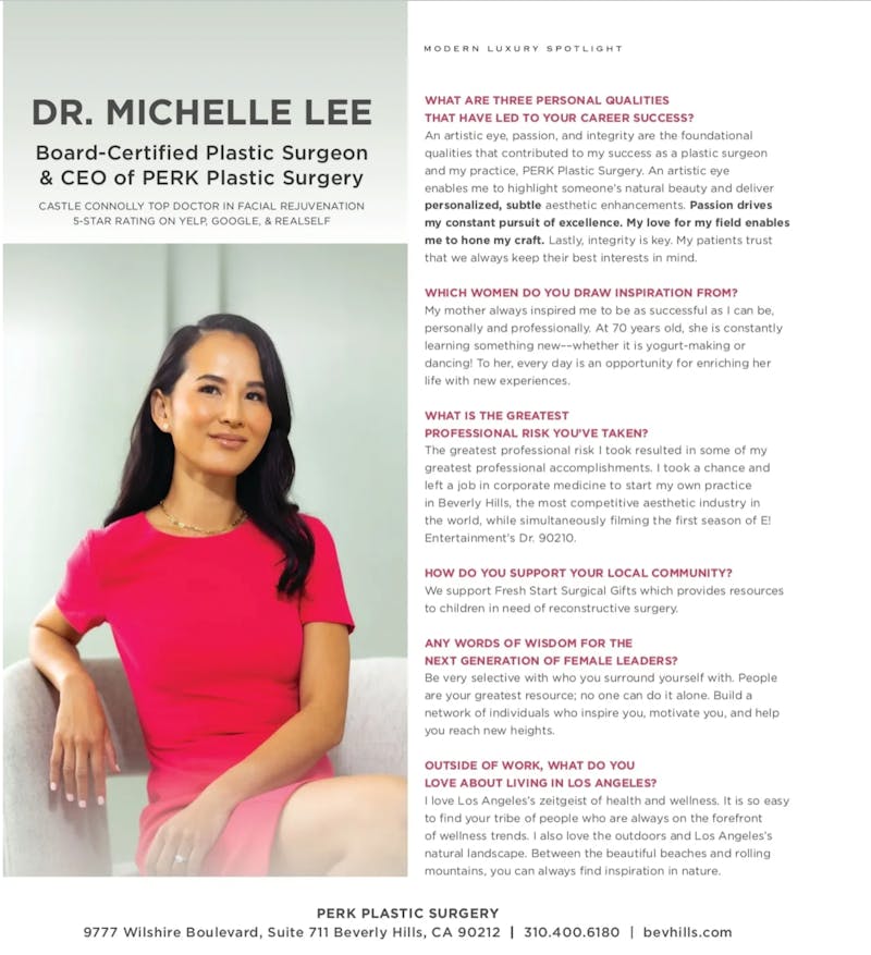 Dr. Michelle Lee Named a Dynamic Leader in Modern Luxury Angeleno's Prestigious Profile Series In a city full of dynamic and successful women, like Los Angeles, standing out as a leader in your field isn’t easy. This is why Dr. Michelle Lee’s feature in Modern L...